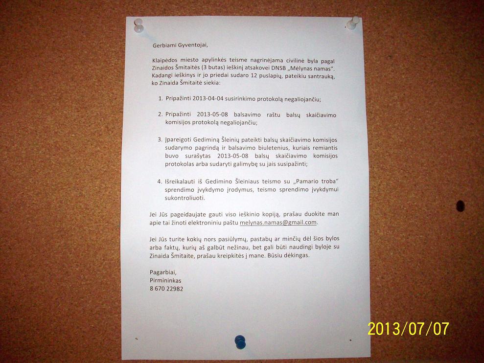 Dar kartą noriu atkreipti dėmesį į bendrijos pirmininko skelbimą: „Jei Jūs turite kokių nors pasiūlymų, pastabų ar minčių dėl šios bylos arba faktų, kurių aš galbūt nežinau, bet gali būti naudingi byloje su Z. Š., prašau kreipkitės į mane.“