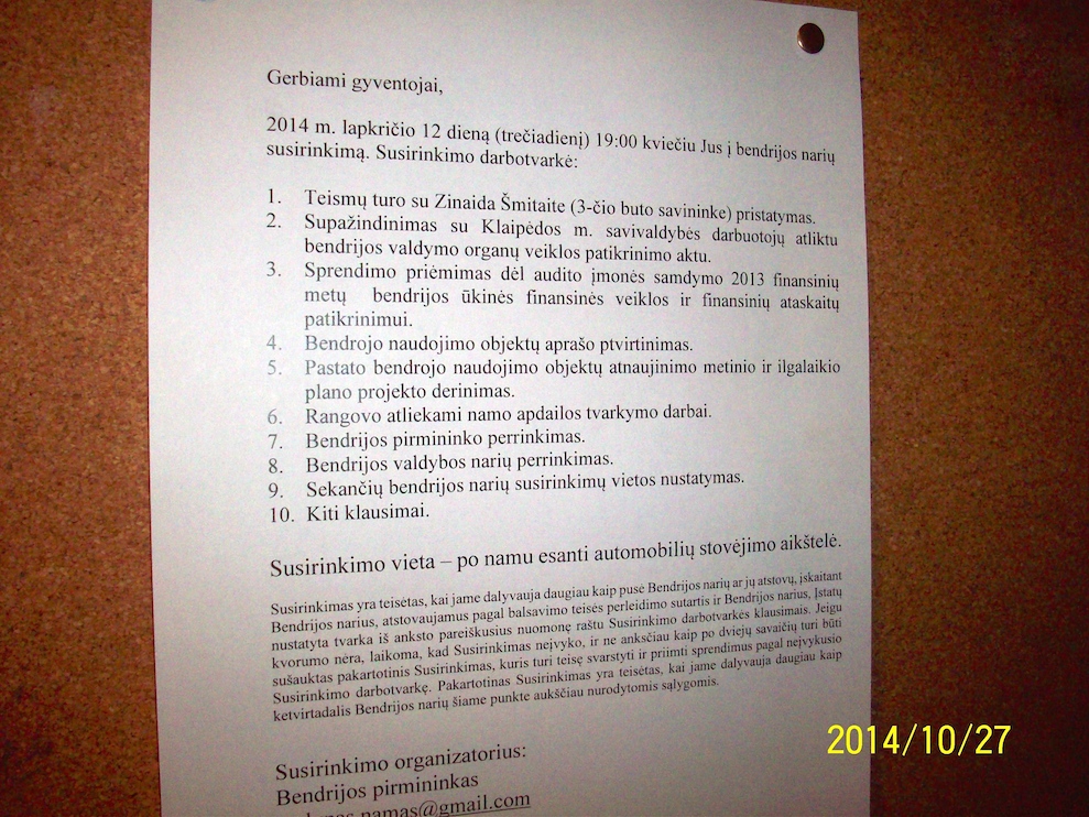 2014-11-12 planuotas susirinkimas neįvyko, nes nesusirinko kvorumas. Tačiau buvo proga pasikalbėti ir pagaliau gyventojai išreiškė savo nuomonę ne tik apie netvarką po remonto darbų, bet ir apie bendrijos veiklos patikrinimą, audito įmonės samdymą bei netinkamai vedamą politiką (tikriausia bendrijoje). Taip pat buvo pasiūlymas bendriją likviduoti. (daugiau…)