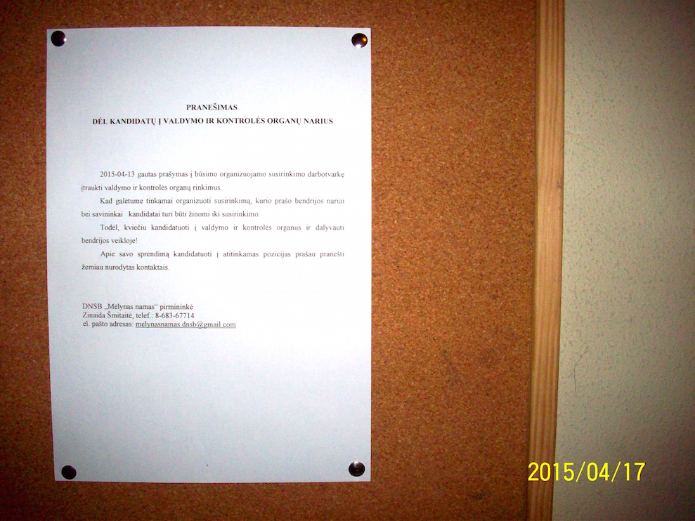 2015-03-31 gavau grupės bendrijos narių prašymą organizuoti susirinkimą. Remiantis LR Daugiabučių gyvenamųjų namų ir kitos paskirties pastatų savininkų bendrijų įstatymo 11 str. 3 d. visuotinis susirinkimas turi būti šaukiamas kasmet ne vėliau kaip per 3 mėn. pasibaigus finansiniams metams. Tačiau (daugiau…)